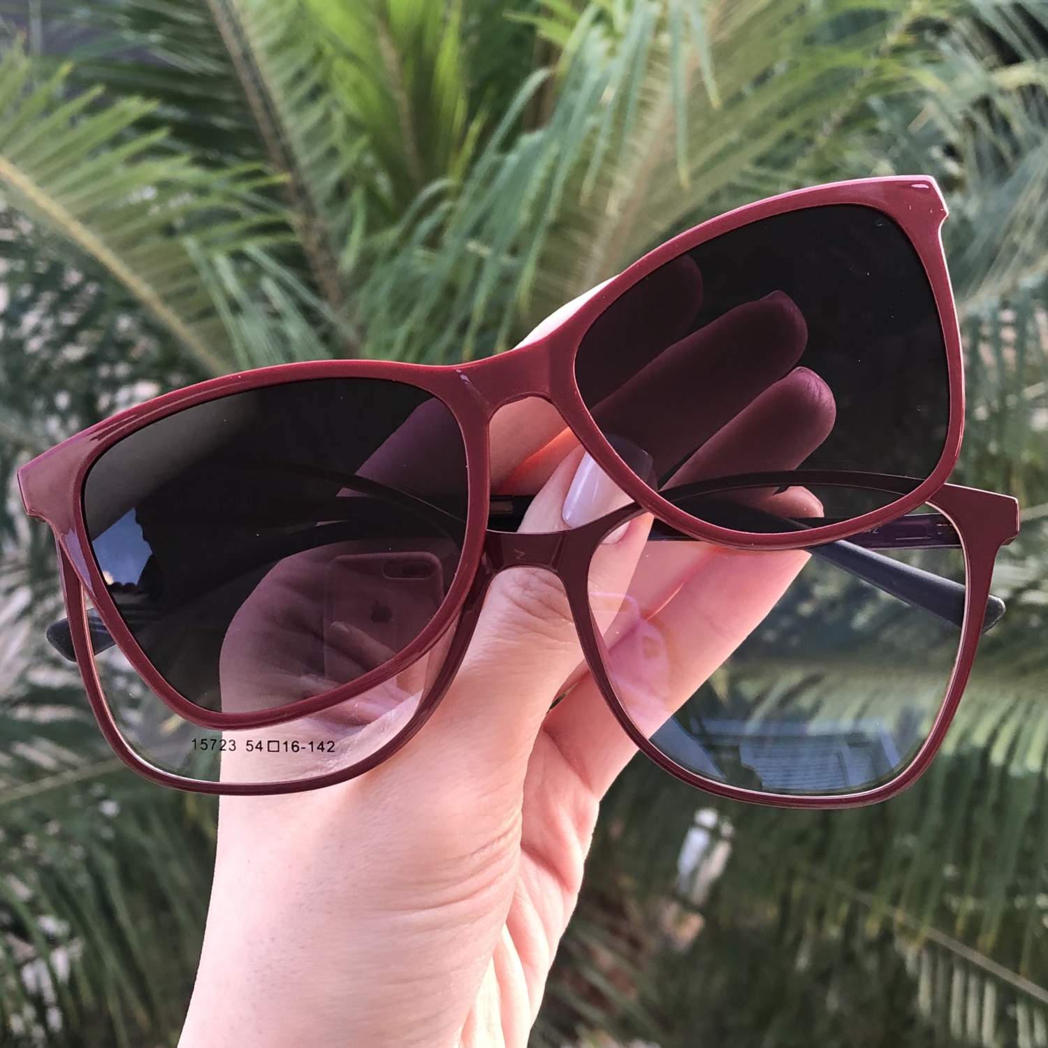 A armação 2 em 1 é nossa campeã de vendas. Confortável de usar e atual é muito versátil podendo ser usada como armação solar também, além de combinar com diferentes estilos e formatos de rosto.
