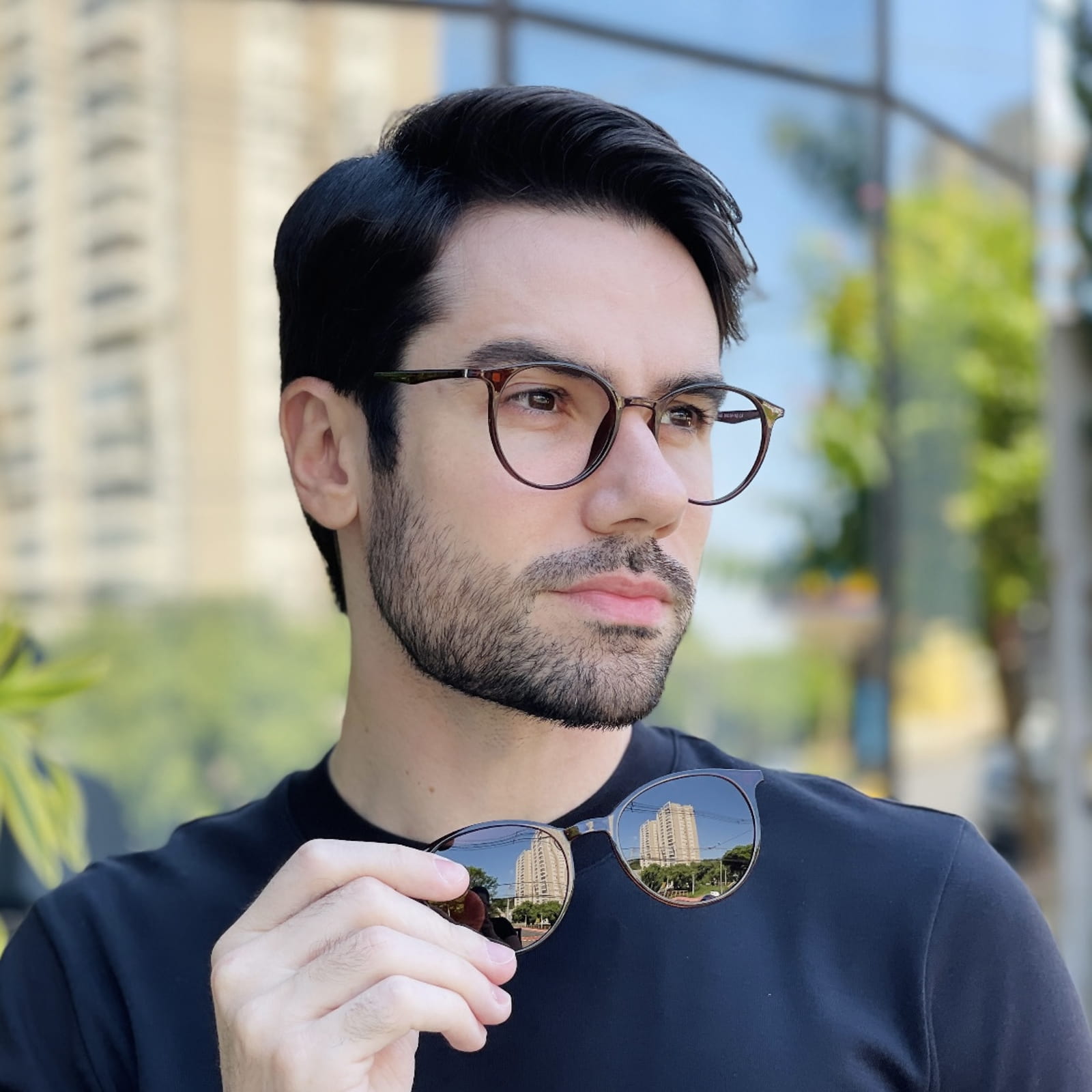 Os óculos clip on redondo masculino são feitos de um material resistente e leve ideal para uso diário.