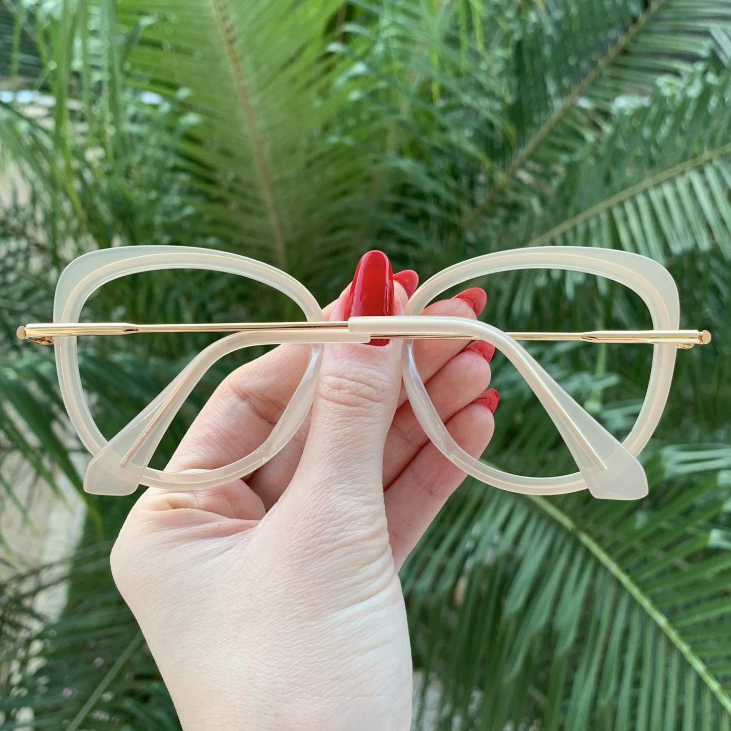 Óculos de Grau Gatinho Nude Cris é cheio de estilo! Sua armação é em metal dourado e possui acabamento em TR90, o que o deixa leve e muito resistente. Esse modelo é ideal para seu dia a dia e também para completar aquele look. Seu formato gatinho é perfeito para rostos mais redondos, ovais ou triangulares.