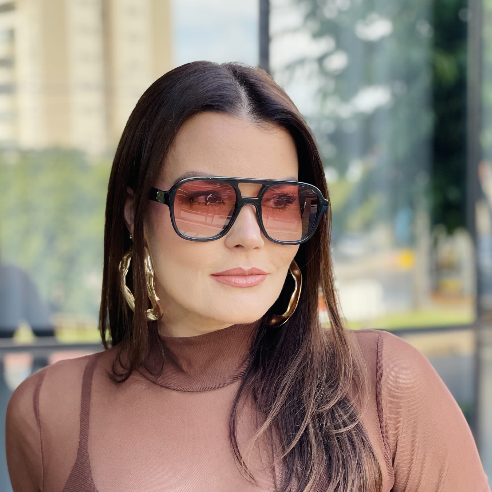 Além disso, o design com linhas marcantes e ponte dupla traz mais presença ao visual, criando um efeito moderno e sofisticado.