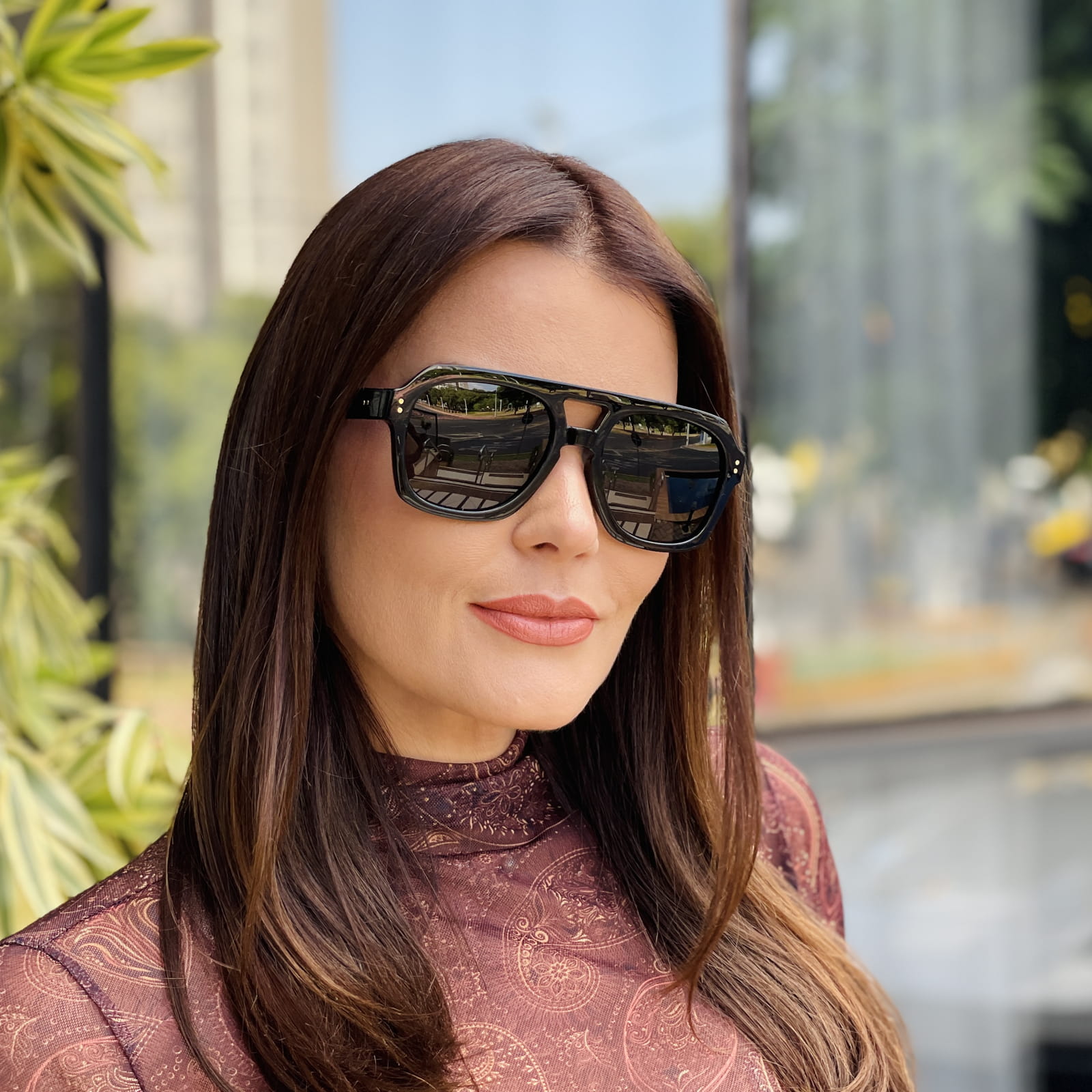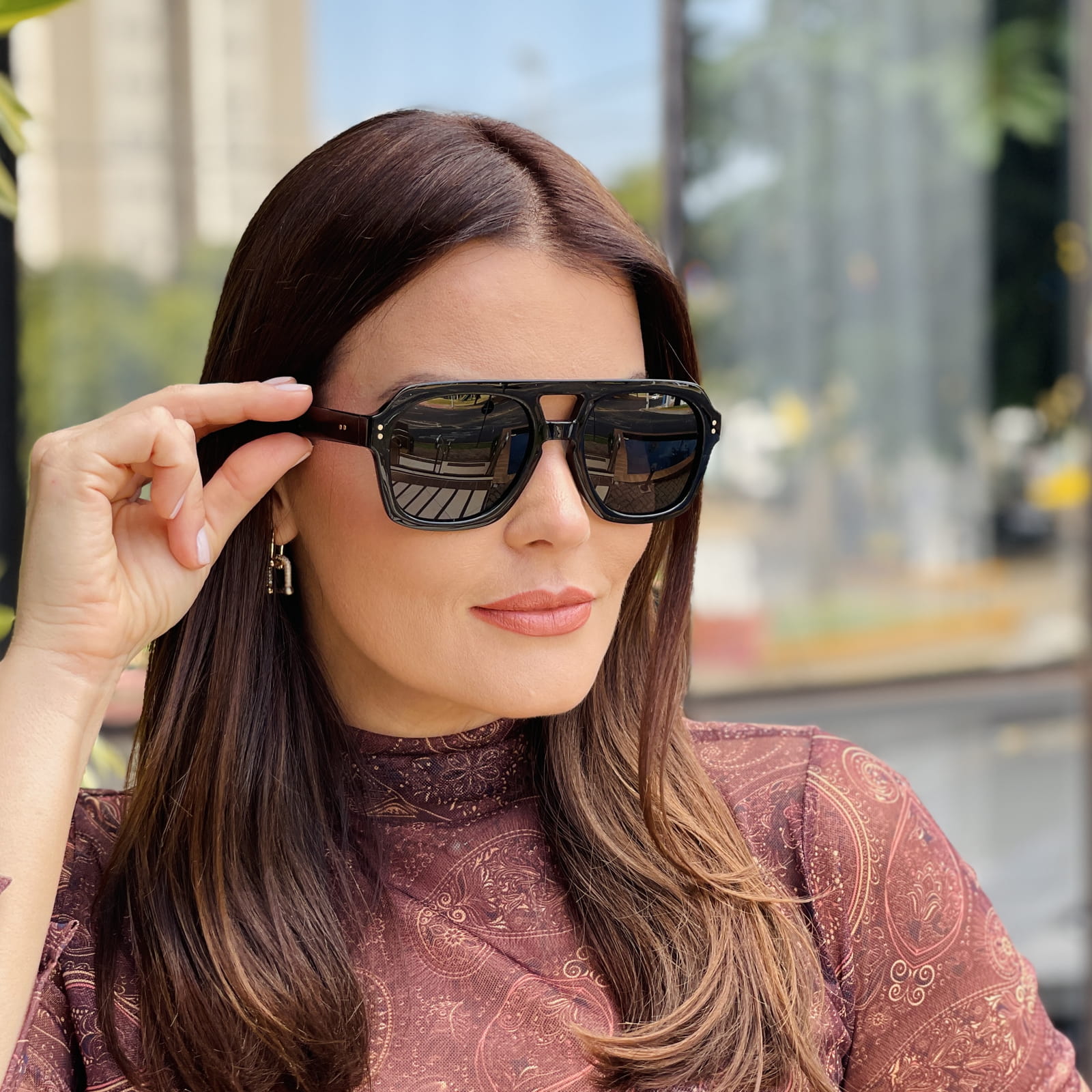 Além disso, o design com linhas marcantes e ponte dupla traz mais presença ao visual, criando um efeito moderno e sofisticado.